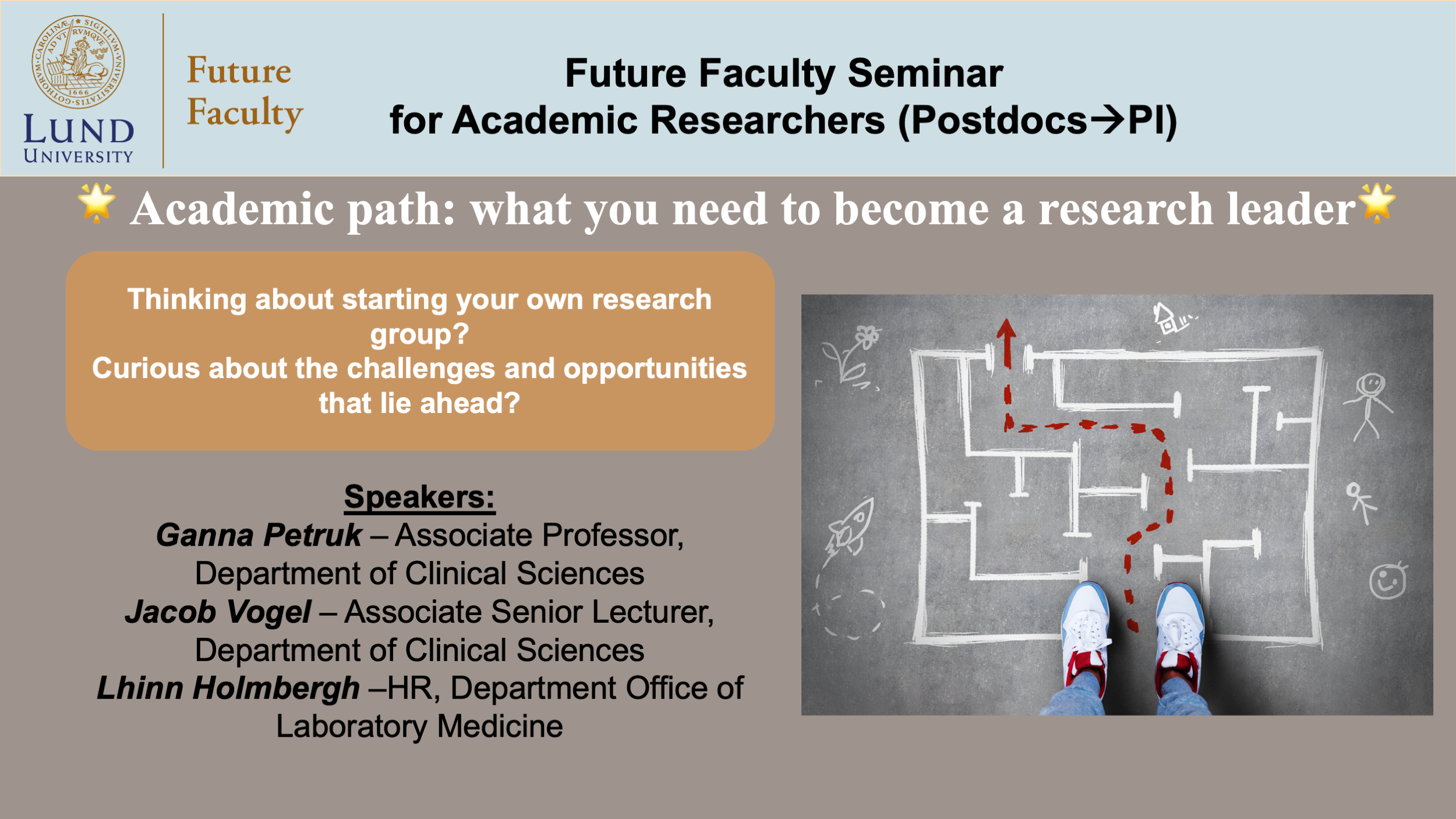 Navigating an academic career involves more than research excellence alone. There are practical aspects, institutional frameworks, and expectations that shape the journey—sometimes openly discussed, sometimes less so. In this session, Docent Ganna Petruk and Associate Senior Lecturer Jacob Vogel will share personal experiences and insights from their own paths toward becoming independent research leaders. Lhinn Holmbergh, Administrative Manager at the Department Office of Laboratory Medicine, will provide valuable perspectives on academic regulations and procedures—essential knowledge to help you move forward confidently, whether or not you see these aspects as central to your research.